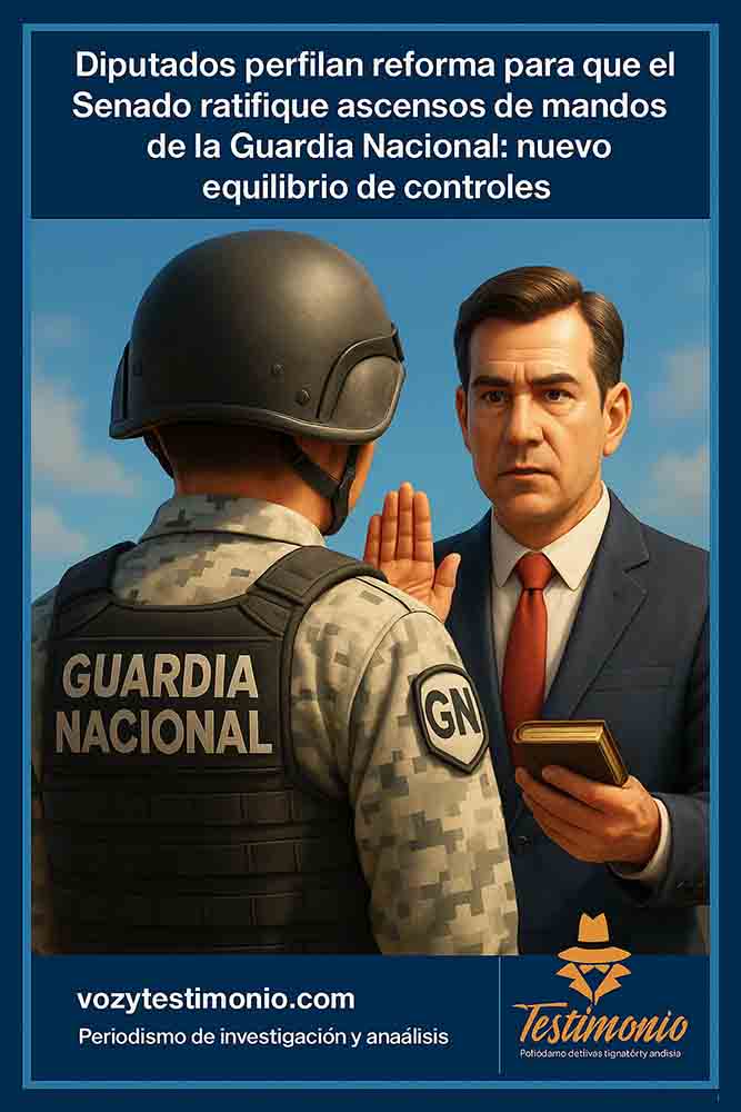 Ciudad de México, 22 sep. — La Comisión de Puntos Constitucionales de la Cámara de Diputados tiene previsto aprobar hoy el dictamen que reforma los artículos 76 y 79 de la Constitución para que el Senado pueda ratificar los ascensos de coroneles y mandos superiores de la Guardia Nacional (GN), de la misma forma que ocurre con el Ejército, la Armada y la Fuerza Aérea. El dictamen responde a una corrección técnica pues, tras la adscripción de la GN al sector de Defensa, la Constitución no incluía expresamente esa ratificación senatorial para sus cargos. La Jornada