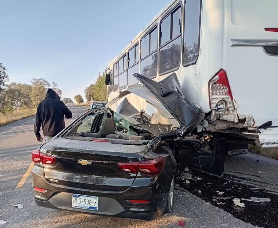 En la escena se observa un automóvil Chevrolet negro, severamente dañado del cofre y el techo, el cual quedó incrustado en la parte posterior de la unidad de transporte. El golpe generó un colapso importante de la estructura del vehículo, dejando vidrios y piezas metálicas dispersas sobre la cinta asfáltica.