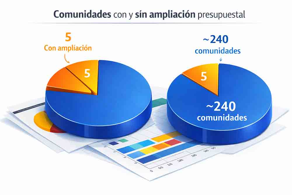A partir de ahí, las modificaciones presupuestales adquieren otra dimensión. Las ampliaciones se concentraron en un número reducido de comunidades y representaron incrementos significativos, mientras la mayoría permaneció sin cambios o fuera del mapa presupuestal. Todo esto es legal, documentado y aprobado conforme a la ley. Pero también es revelador.