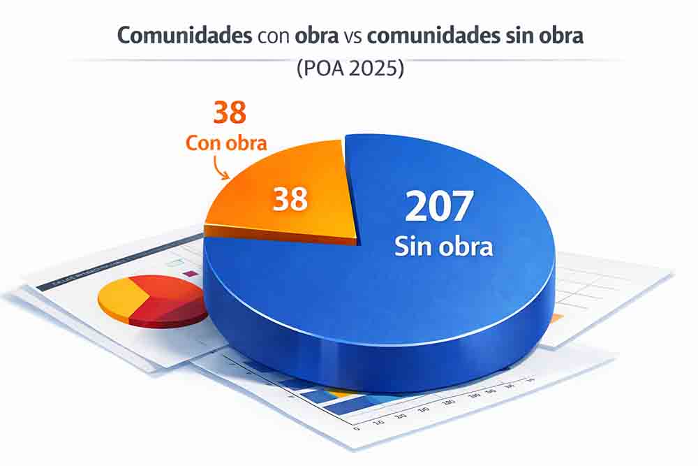Sin embargo, antes incluso de analizar quién ganó o perdió con las ampliaciones, el corte más revelador es otro: la cobertura real del POA 2025. De aproximadamente 245 comunidades que integran el municipio, solo 38 tuvieron al menos una obra contemplada. Las otras 207 comunidades quedaron completamente fuera del programa de obra.