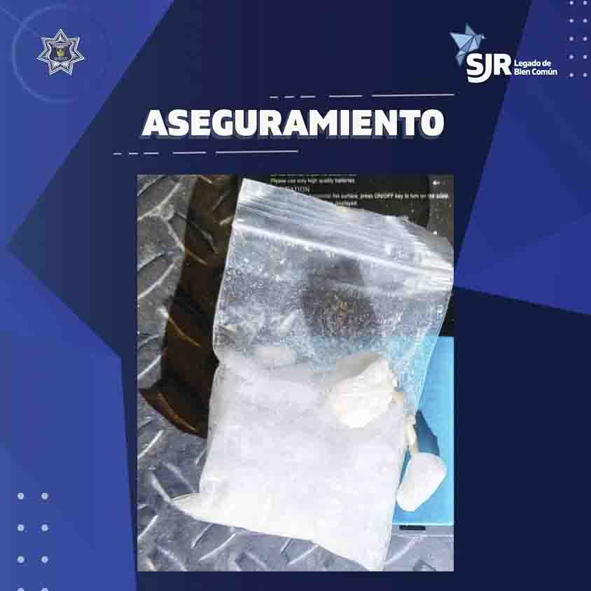 Al ubicar al sujeto con las características señaladas, éste adoptó una actitud evasiva, por lo que fue interceptado y sometido a la inspección preventiva. Durante la revisión, se le localizó una bolsa tipo ziploc con contenido granulado cristalino, con características propias de la metanfetamina.