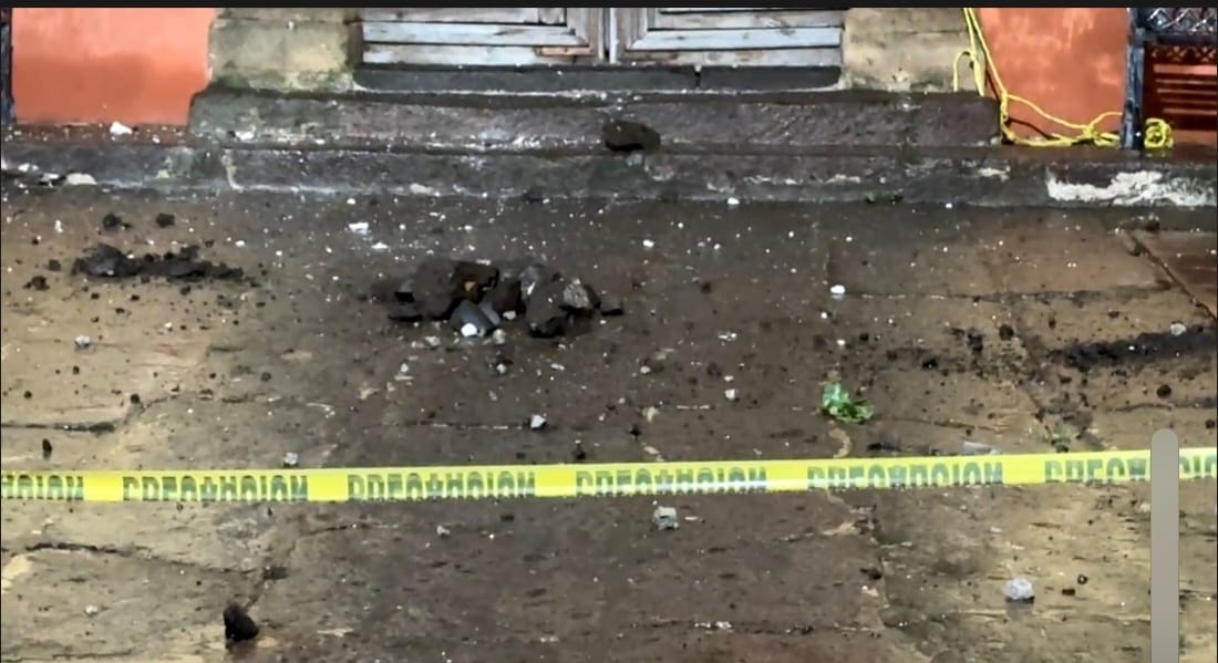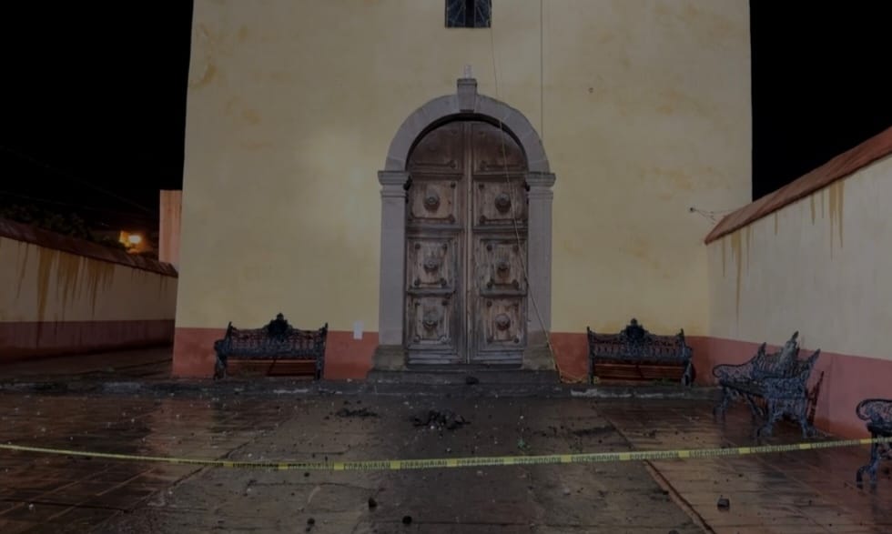 El impacto destrozó la cruz ubicada en lo alto de la edificación, dejando visibles los daños en la entrada principal y el patio del recinto.