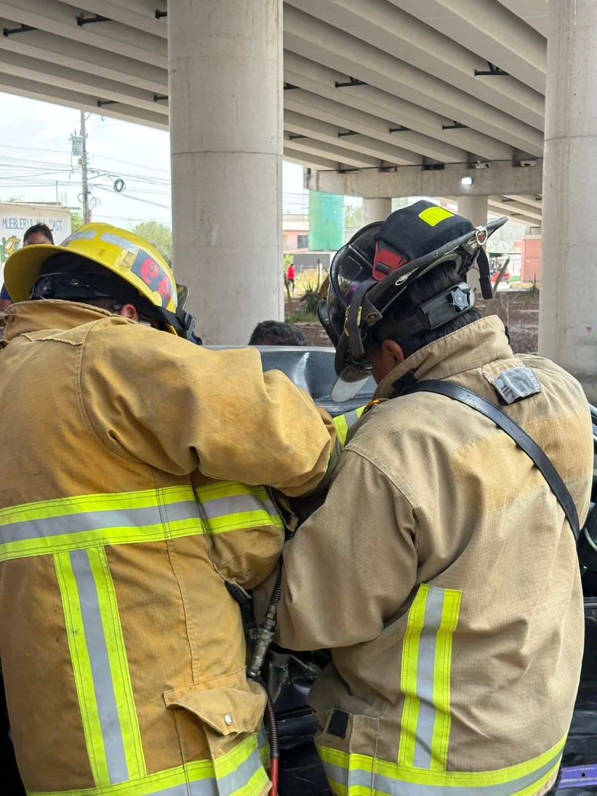 Con maniobras de precisión, los brigadistas lograron liberar al afectado, mientras otros elementos se encargaban de contener riesgos y limpiar la carpeta asfáltica, que había quedado comprometida por el accidente.