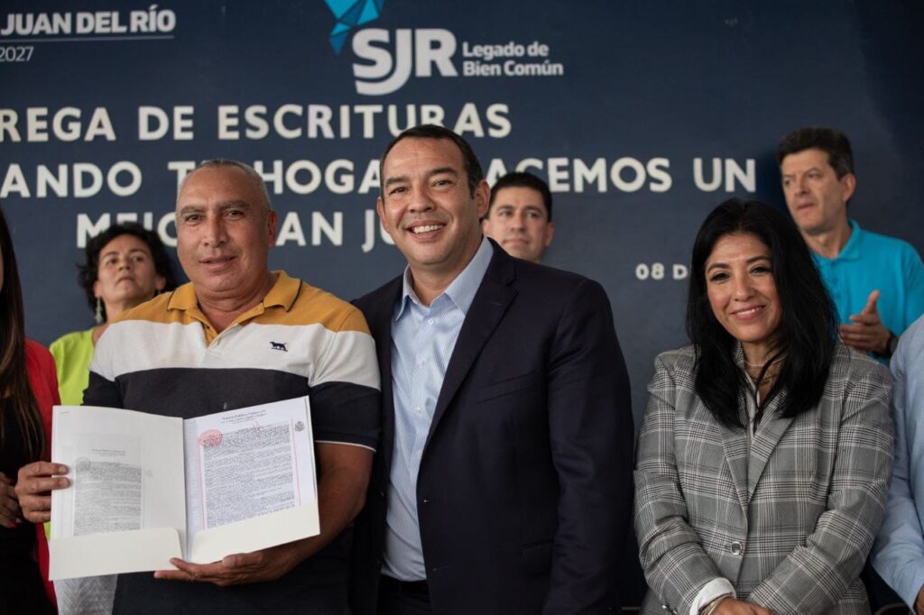 San Juan del Rio, Qro.-Con la finalidad de brindar tranquilidad, seguridad y certeza jurídica al patrimonio de las y los sanjuanenses, el presidente municipal de San Juan del Río, Roberto Cabrera Valencia, entregó 212 escrituras a familias de las colonias Loma Linda segunda sección, Unidad Vecinal San Pedro 3 y Real de San Antonio.
